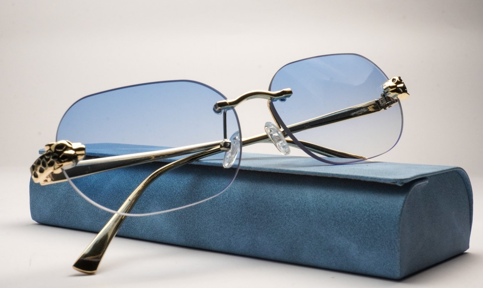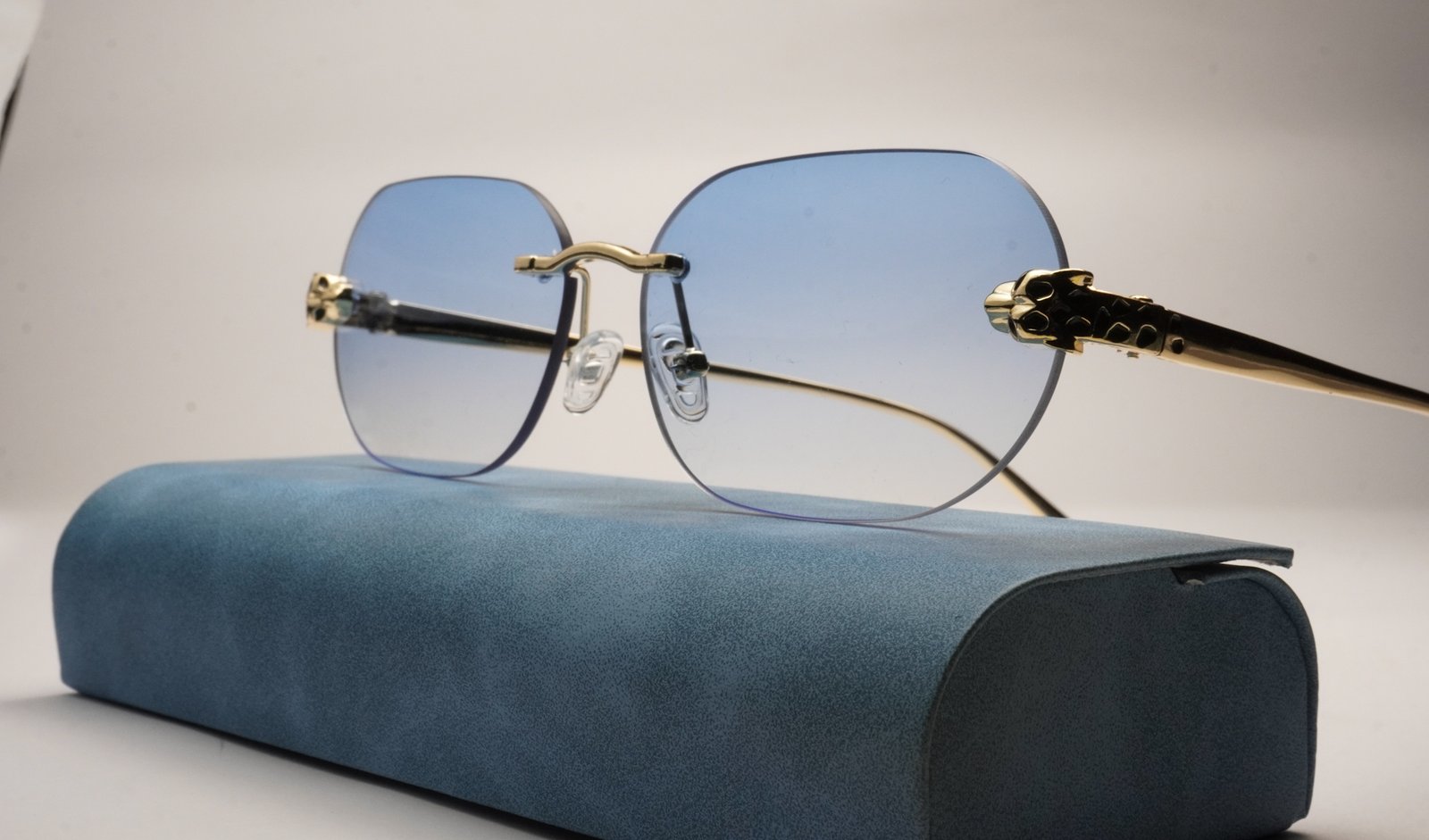 The centerpiece of these glasses is the intricately detailed, gold-tone panther head that adorns each hinge, instantly elevating the design from simple to statement. The frameless, elongated oval lenses feature a cool blue gradient tint, fading smoothly from a deep azure at the top to a crystal-clear light blue at the bottom.